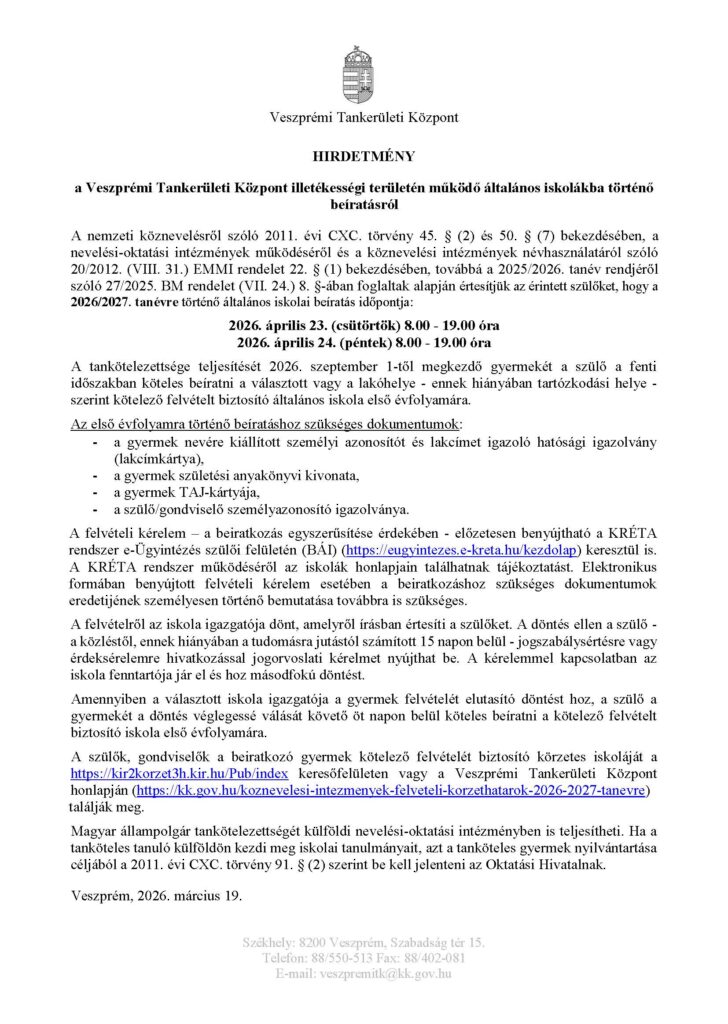 ELSŐS beiratkozás április 23. csütörtök – április 24. péntek